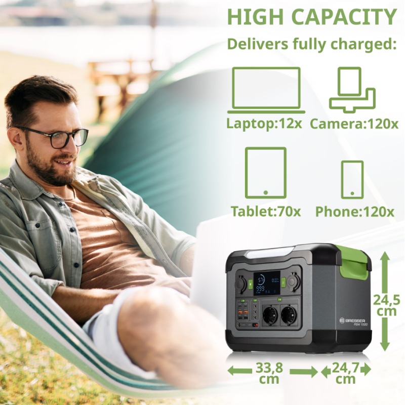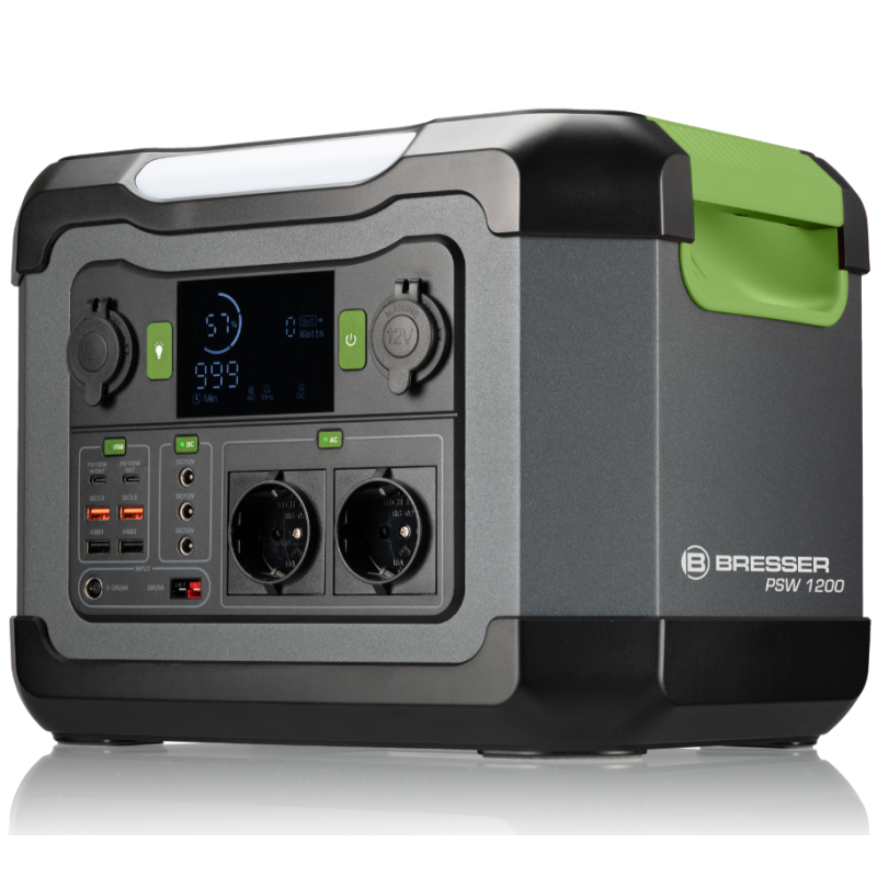 BRESSER strømstationen kan bruges til at oplade op til seks mobile enheder samtidigt via USB, såsom telefoner, MP3-afspillere, spillekonsoller, kameraer og droner. Enheden er udstyret med to USB-A porte, to USB-C porte og to USB-A hurtigopladningsporte, der understøtter Qualcomm Quick Charge 3.0. Du kan også drive op til fem 12 V enheder med et samlet strømforbrug på 10 A via de to direkte bilcigarettænderstik og de tre DC 2,1/5,5 mm stik. Strømstationen leveres med to 5,5/2,1 mm koaksiale stik til cigarettænderadaptere, som kan bruges til at tilslutte bil/camping enheder såsom kølebokse, vandpumper, minikompressorer og luftpumper direkte eller parallelt. Enheden er også udstyret med to stikkontakter med 230 V og 1200 W samlet kontinuerlig udgang, hvilket er ideelt til tilslutning af laptop/tablet/smartphone opladere, kølebokse og musikinstrumenter eller andre elektriske enheder i denne effektklasse.