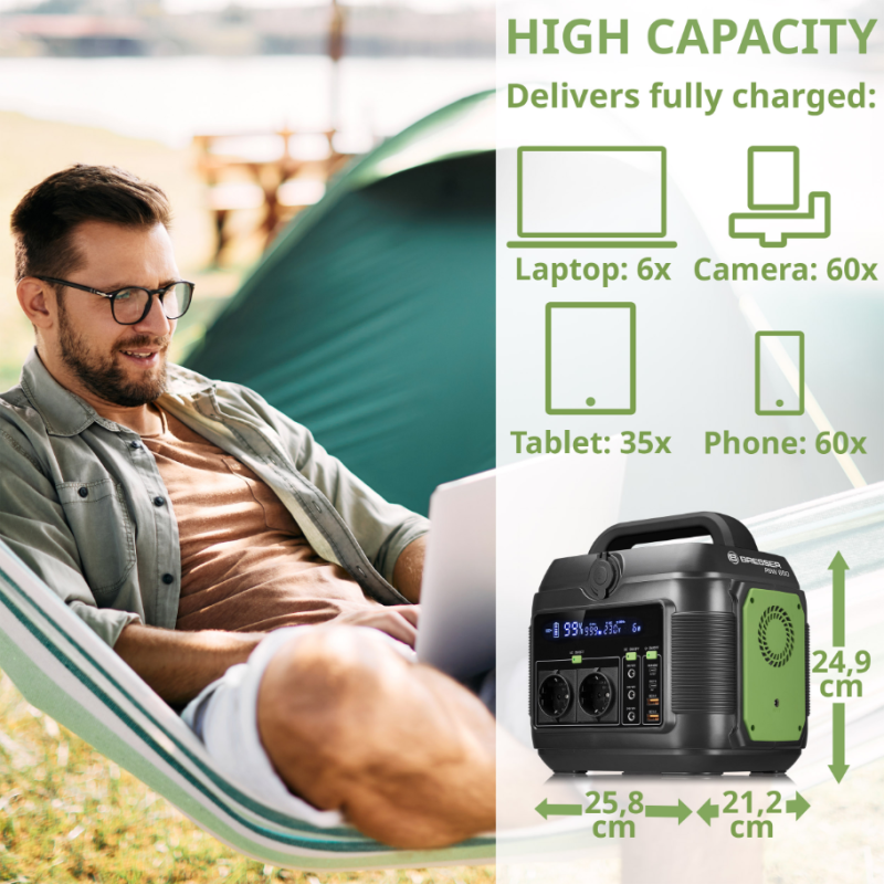 Oplad dine elektriske enheder sikkert, uanset om du har brug for ekstra power på din camping tur, på festival, i haven eller i hjemmet efter strømafbrydelser. Strøm stationen håndtere enhver situation.
