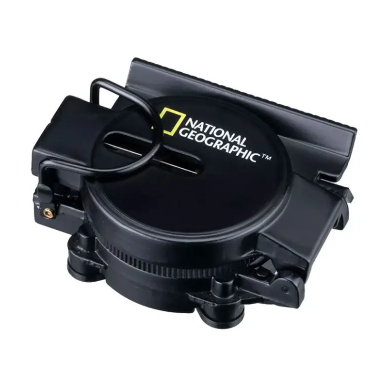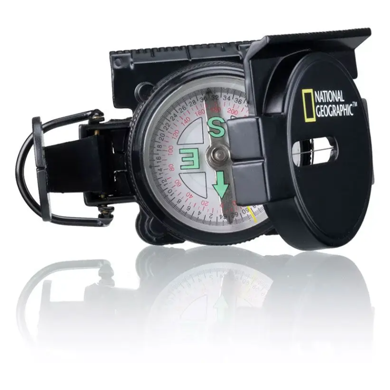 Robust pejlekompas fra NATIONAL GEORAPHIC. Kompasset er lavet i stål og har indbygget centimeter og måleskala. Kompasset har desuden synstråd som giver nøjagtige observation af landmærker.