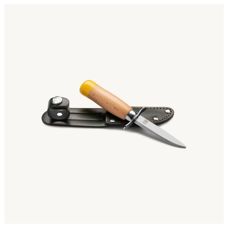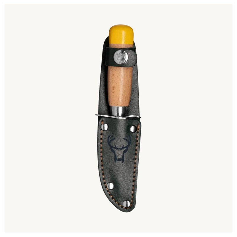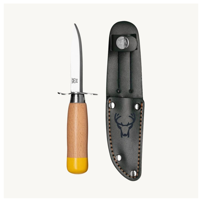 Det er et vigtigt og stolt øjeblik, når man får sin første kniv. Øyos spejderkniv er designet til at give børn frihed til at bruge en kniv på egen hånd. Den har en dobbelt fingerstop og et skaft i bøgetræ, som giver et sikkert greb. Klingen er skarp, da det ofte er lettere at komme til skade på en sløv kniv, men spidsen er afrundet for at undgå stikskader. Kniven er let at slibe og nem at vedligeholde. Den grønne læderskede har en knap, der sikrer kniven, når du er på farten.
