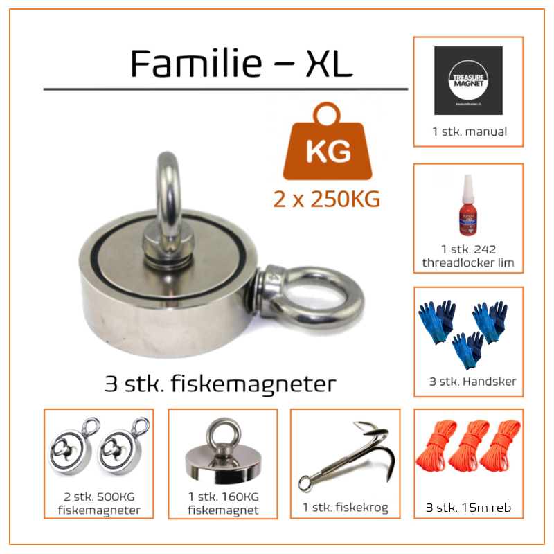 Familiesæt med 3 magneter og masser af tilbehør. Perfekt til 3-4 personer og både til børn, teenagere og voksne. Sættet kommer med 2 stk dobbelt side magneter på hver 500KG trækstyrke (2x250KG) og 1 stk. 160KG fiskemagnet. Derudover kommer sættet med en krog til at fisk selv de sværeste genstande op som har sat sig fast i bunden af søen eller havnen.