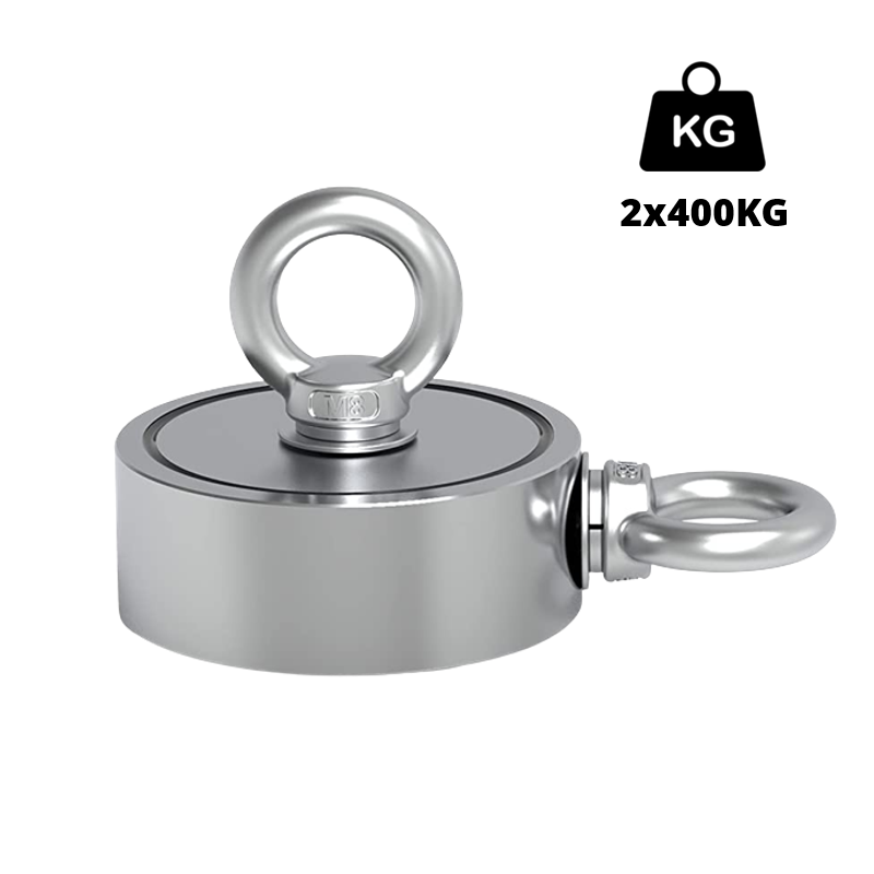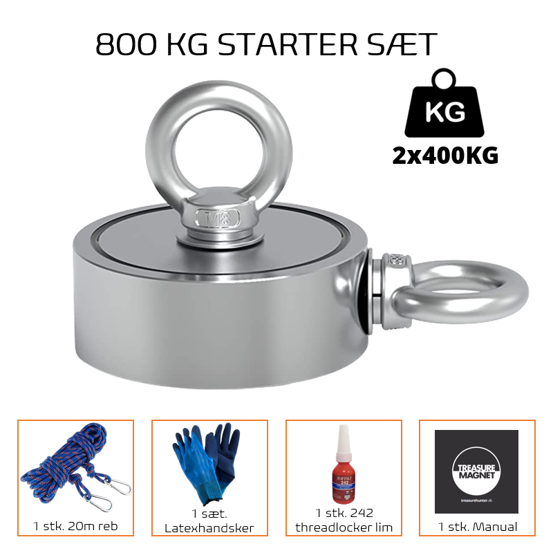 En af vores mest populære fiskemagnet fra TreasureMagnet. Magneten har en trækstyrke på hele 800KG (2x400KG) - nok til at dække de flestes behov. Magneten kan købes både med og uden tilbehør.