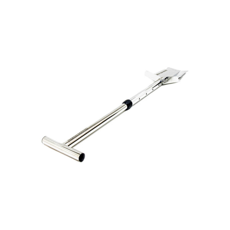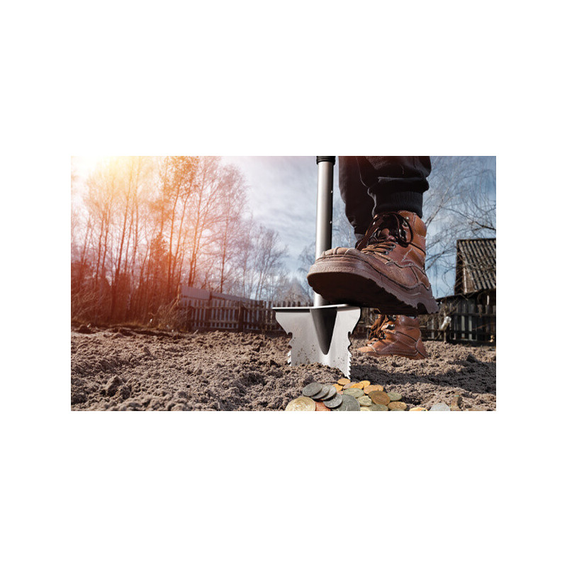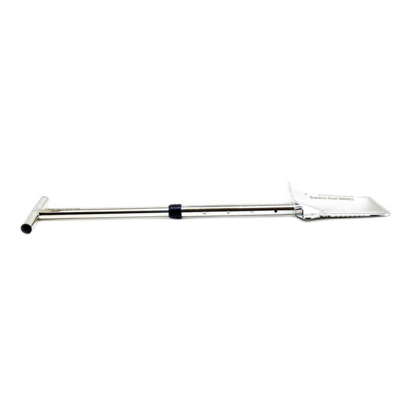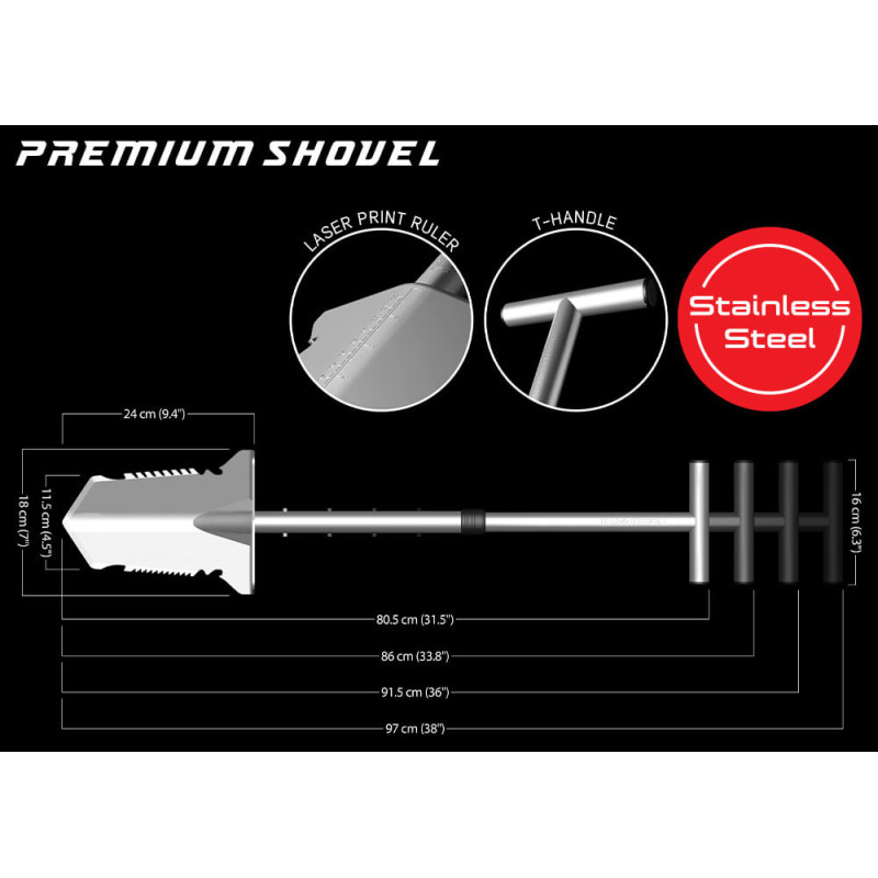Kvalitets Spade konstrueret i kraftigt rustfrit stål. Spaden kan hurtigt deles i 2, samt justeres i længden, så den nemt tilpasses optimalt til den enkelte bruger i længden 80,5 cm til 97 cm. Bladet på spaden er konstrueret i kraftigt rustfrit stål med skære tænder på begge sider af bladet, hvilket gør det nemt at penetrere selv den hårdeste jord, samt jord i skoven hvor rødder kan være en udfordring. Herudover er der på bagsiden af det vinklede blad, laserprintet en målestok med mål op til 46 cm, så dybden af det fundne objekt hurtigt og nemt kan bestemmes. Håndtaget er formet ergonomisk og og bladet har en ekstra bred fodplade, hvilket gør det endnu nemmere at bryde selv den hårdeste jord.