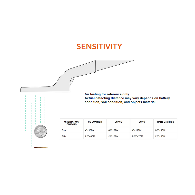 Du kan mærke vibrationerne, se på LED indikation og sågar høre gennem den pulserende lyd, når metal er registreret. Følsomheden / søgedybden kan indstilles i 4 niveauer. Hvis du vil dykke ned til en dybde på flere meter, kan du indstille Quest Scuba Tector til dykketilstand. Denne tilstand sikrer, at de 2 trykknapper ikke aktiveres på grund af tryk under vandet.