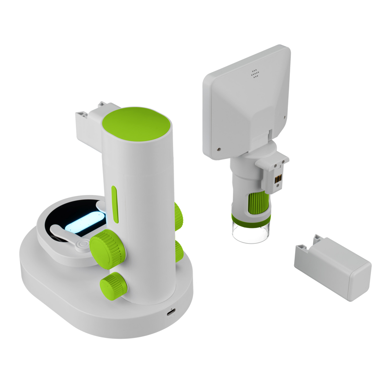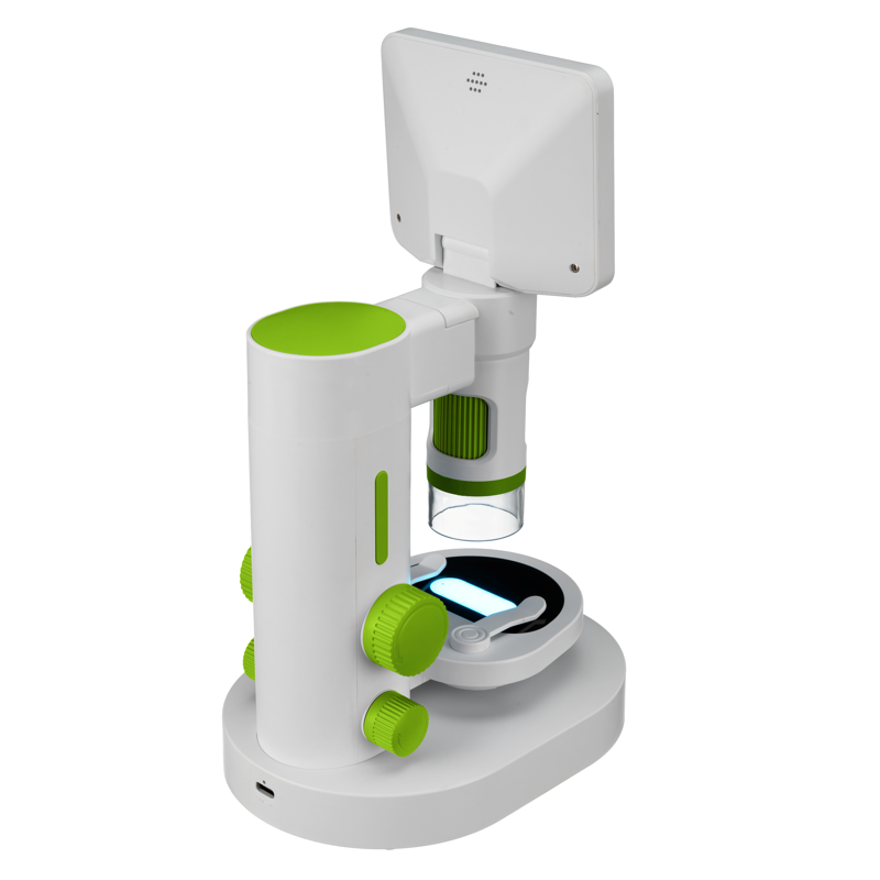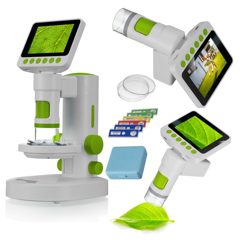 Youngster-mikroskopet fungerer både som håndmikroskop, bordmikroskop og lup, og kan endda bruges som et digitalt teleskop til at zoome ind på objekter længere væk. Det gør det til et alsidigt værktøj for små opdagelsesrejsende.