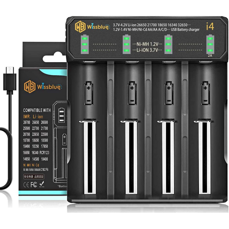 Kvalitetsoplader fra Yonii. Opladeren giver som en af de få mulighed for at oplade hele 4 stk 26650 batterier på én gang.