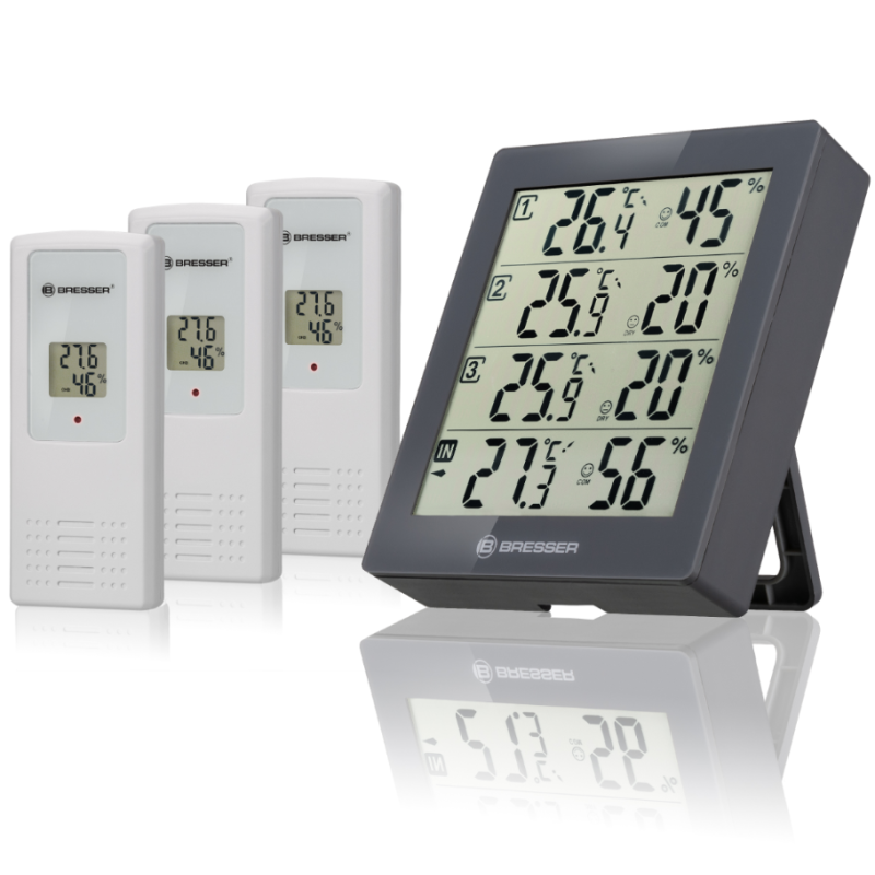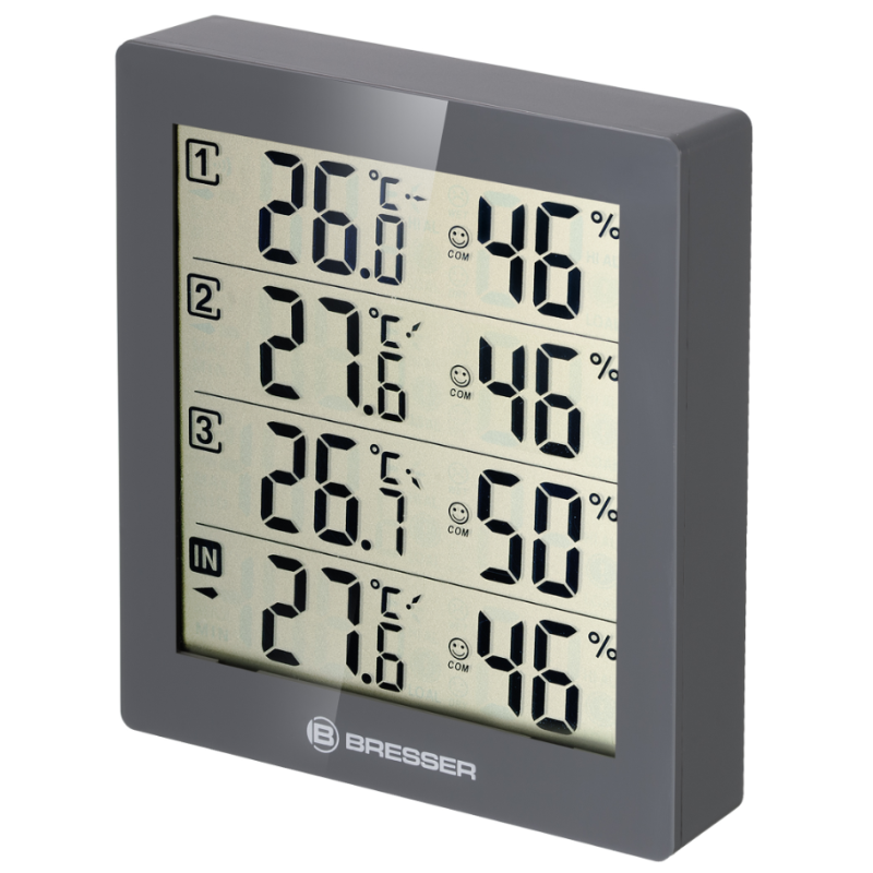 Er dit kælderrum for fugtigt og truet af skimmelsvamp? Er temperaturen i børneværelset i orden? Er det for varmt på terrassen? BRESSER Termo-/Hygrometer Quadro kan give dig svaret på dine spørgsmål. Stationen giver dig mulighed for at måle temperatur og luftfugtighed i eller omkring dit hus, på 4 forskellige steder med enkel overvågning, på ét sted.